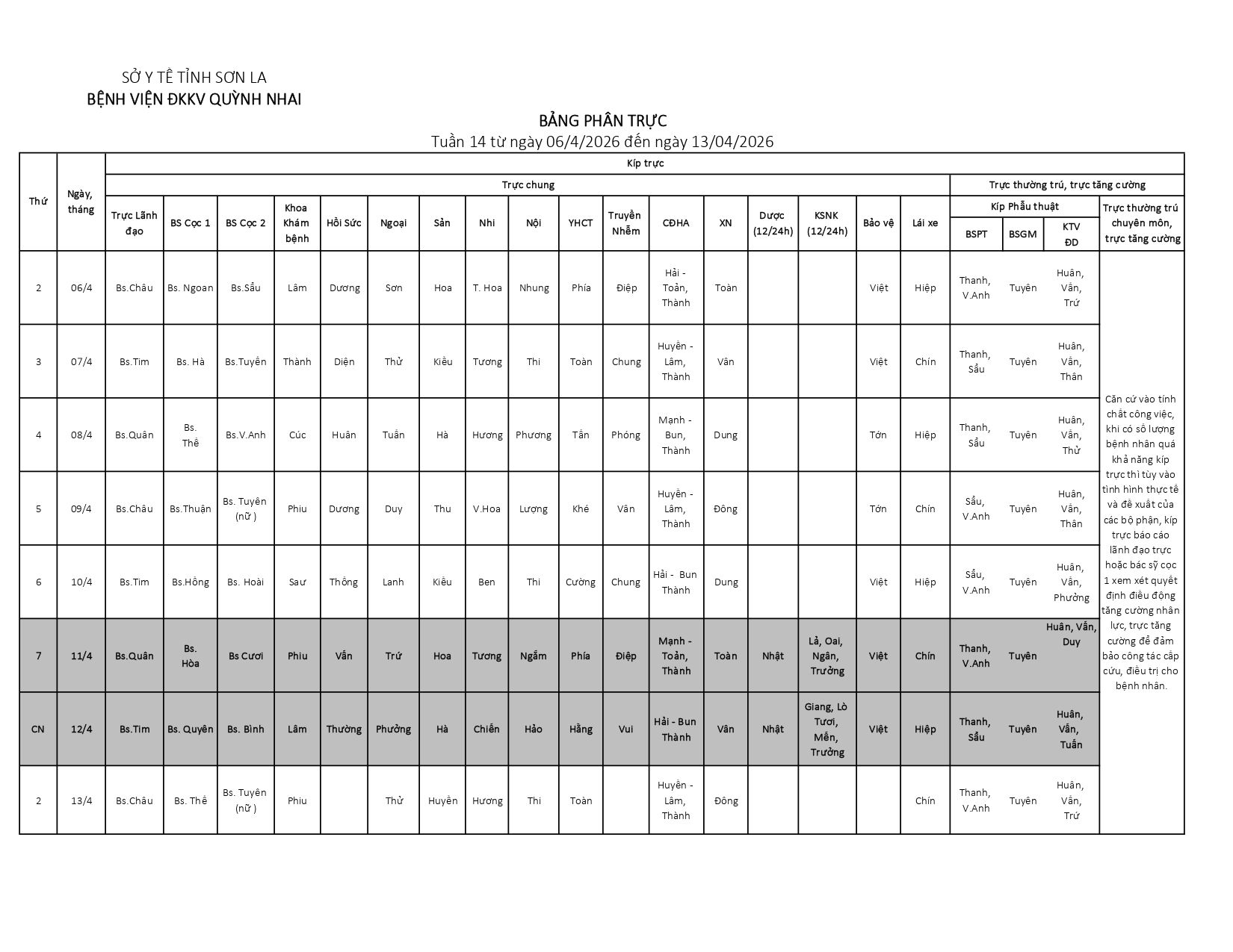 Bảng phân trực tuần 14
