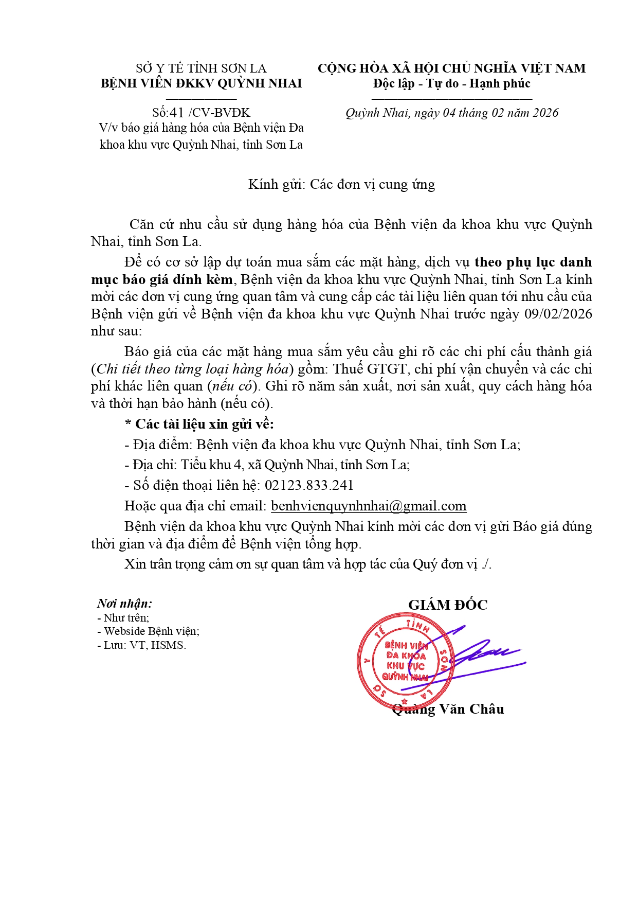 Báo giá hàng hóa của Bệnh viện Đa khoa khu vực Quỳnh Nhai