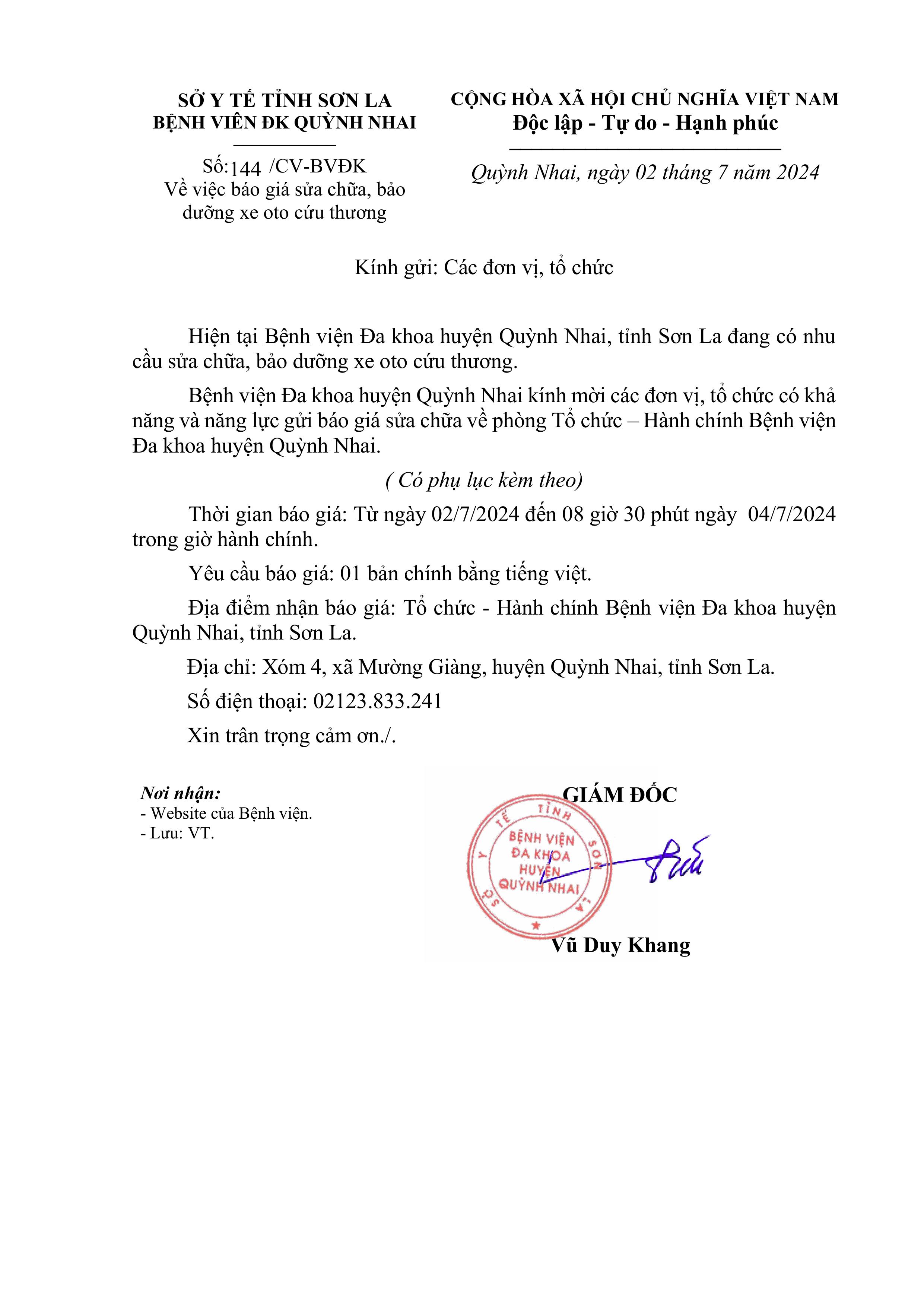 Bệnh viện đa khoa huyện Quỳnh Nhai kính mời báo giá sửa chữa, bảo dưỡng xe oto cứu thương