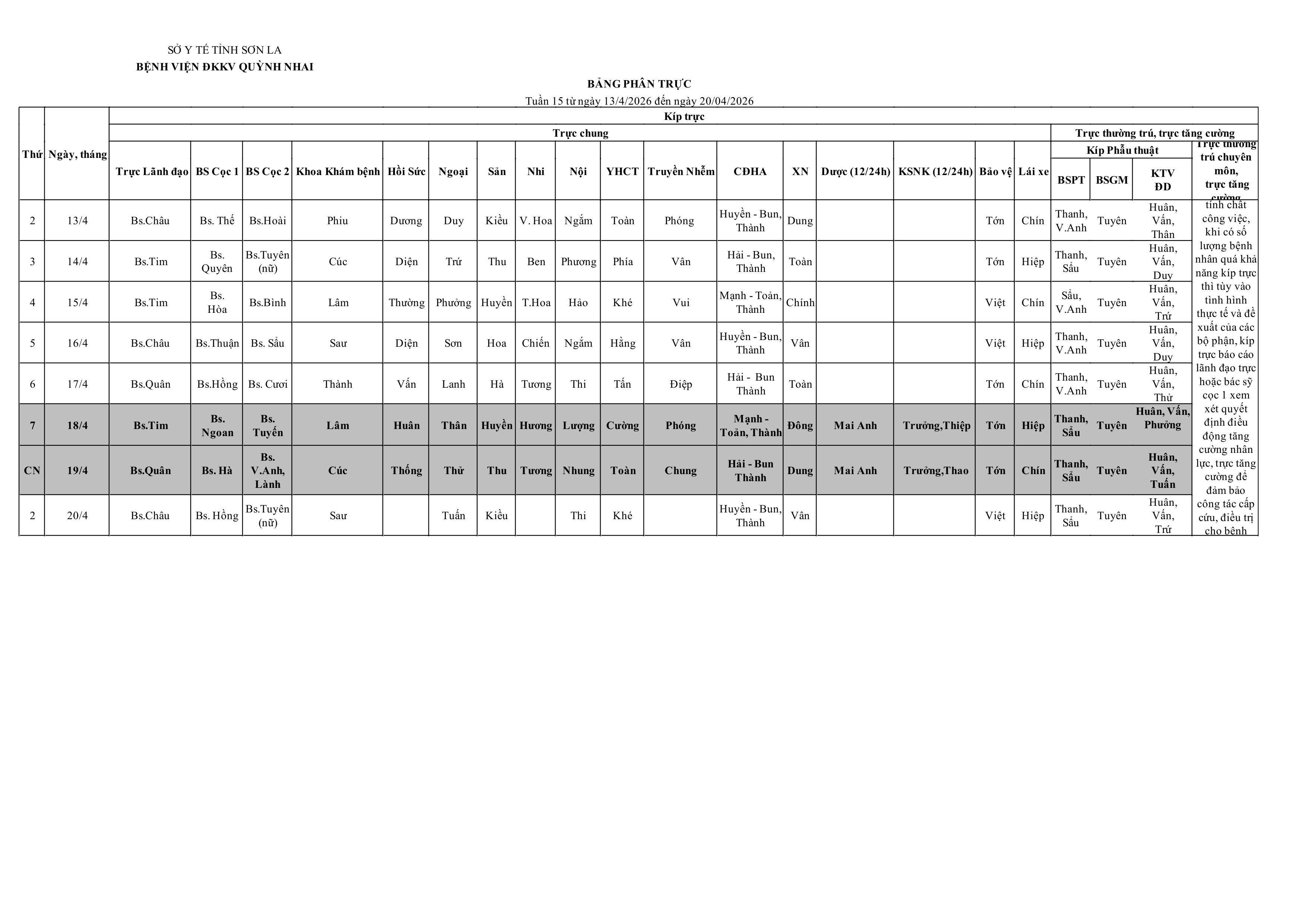 Lịch trực tuần 15 từ ngày 13/4/2026 đến ngày 20/4/2026
