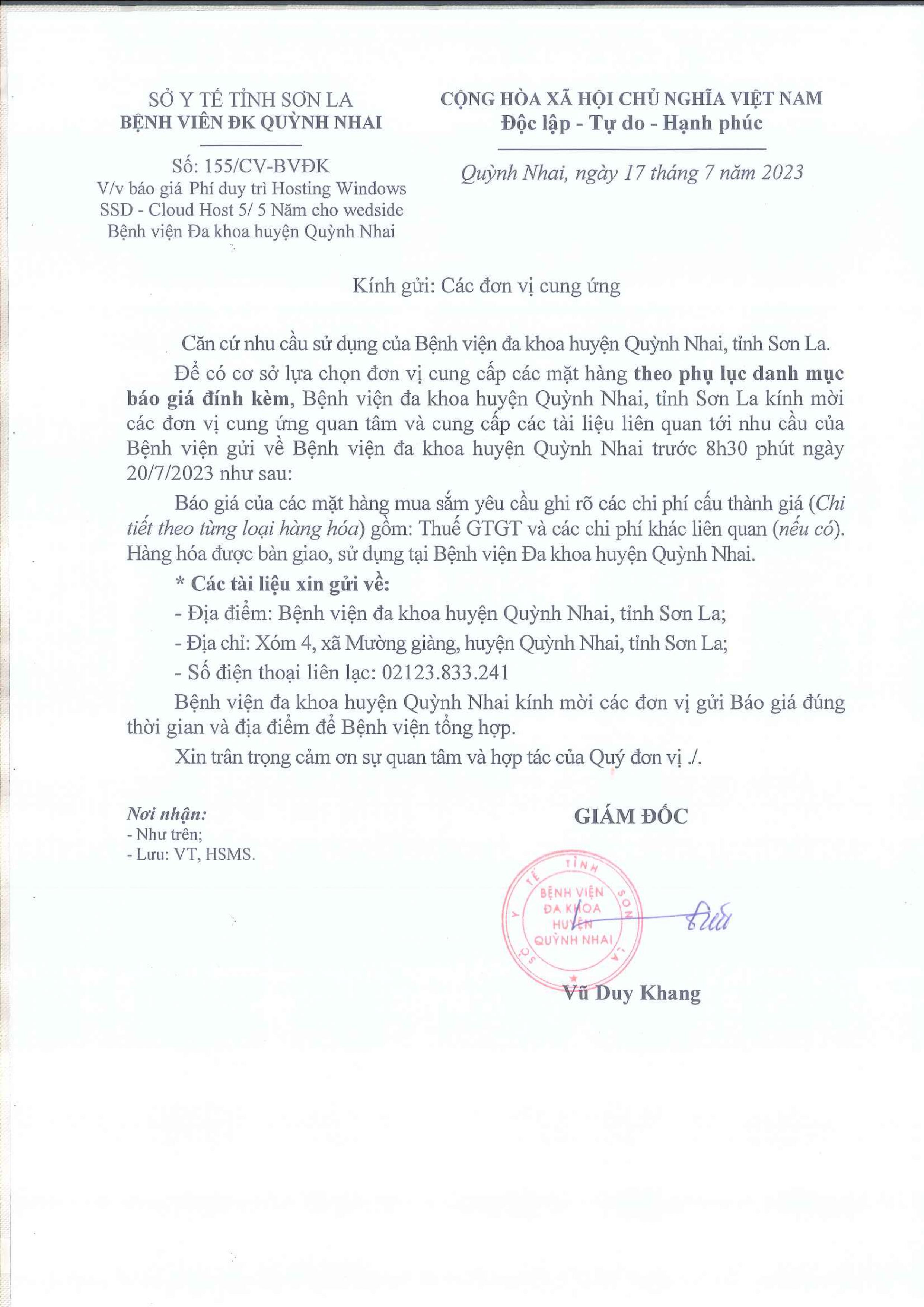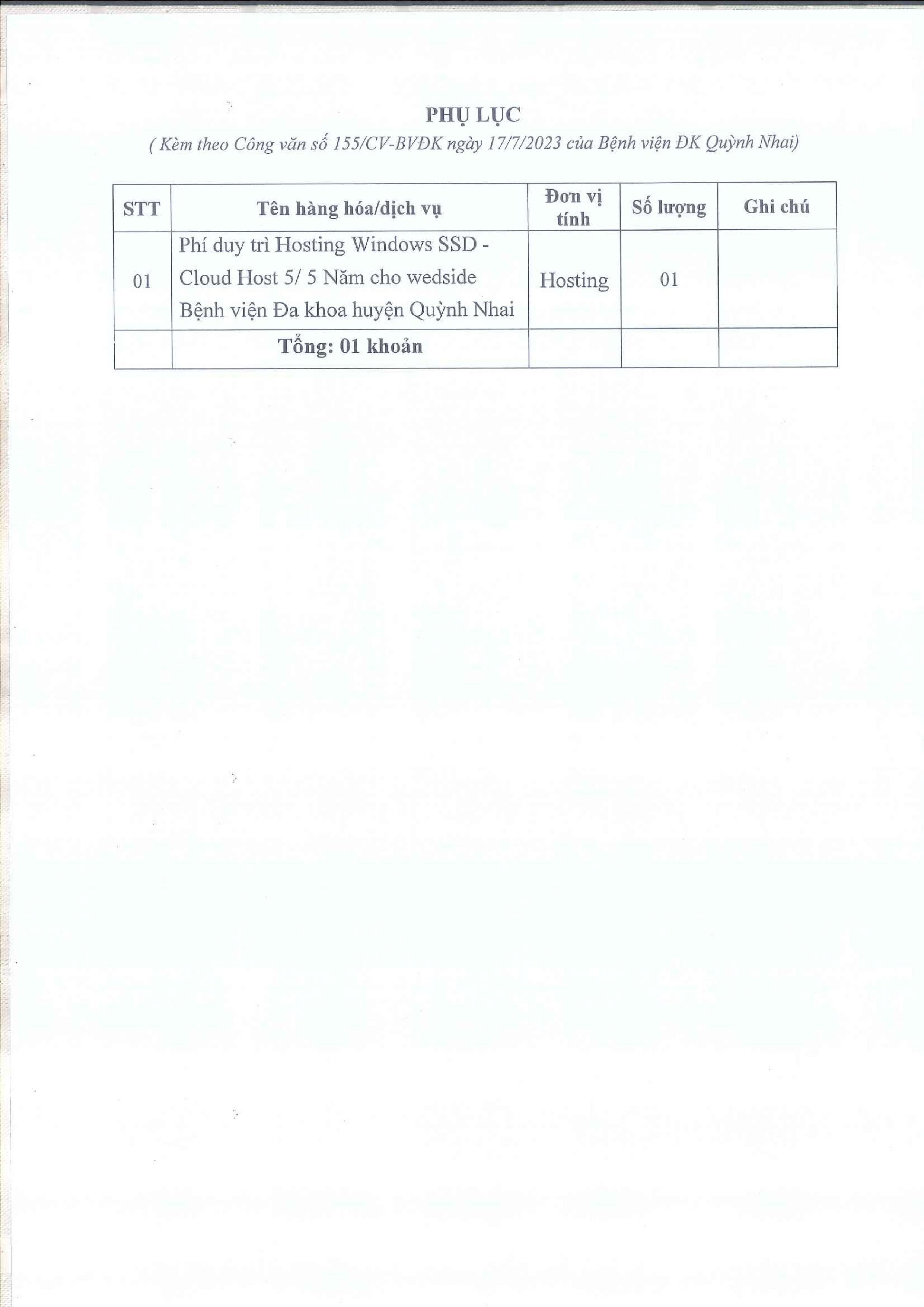 Báo giá phí duy trì Hosting Windows SSD - Cloud Host 5/5 Năm cho WEdside Bệnh viện đa khoa huyên Quỳnh Nhai