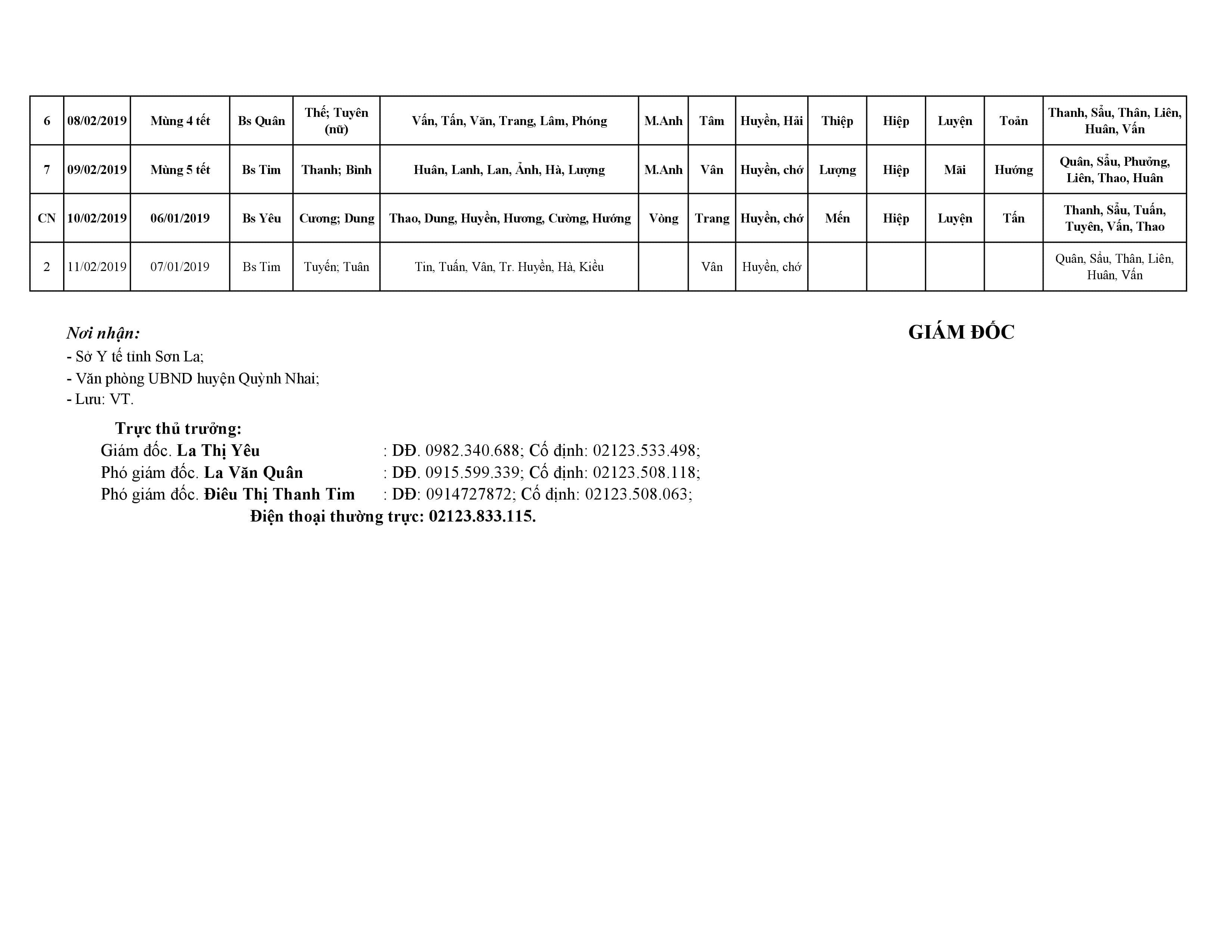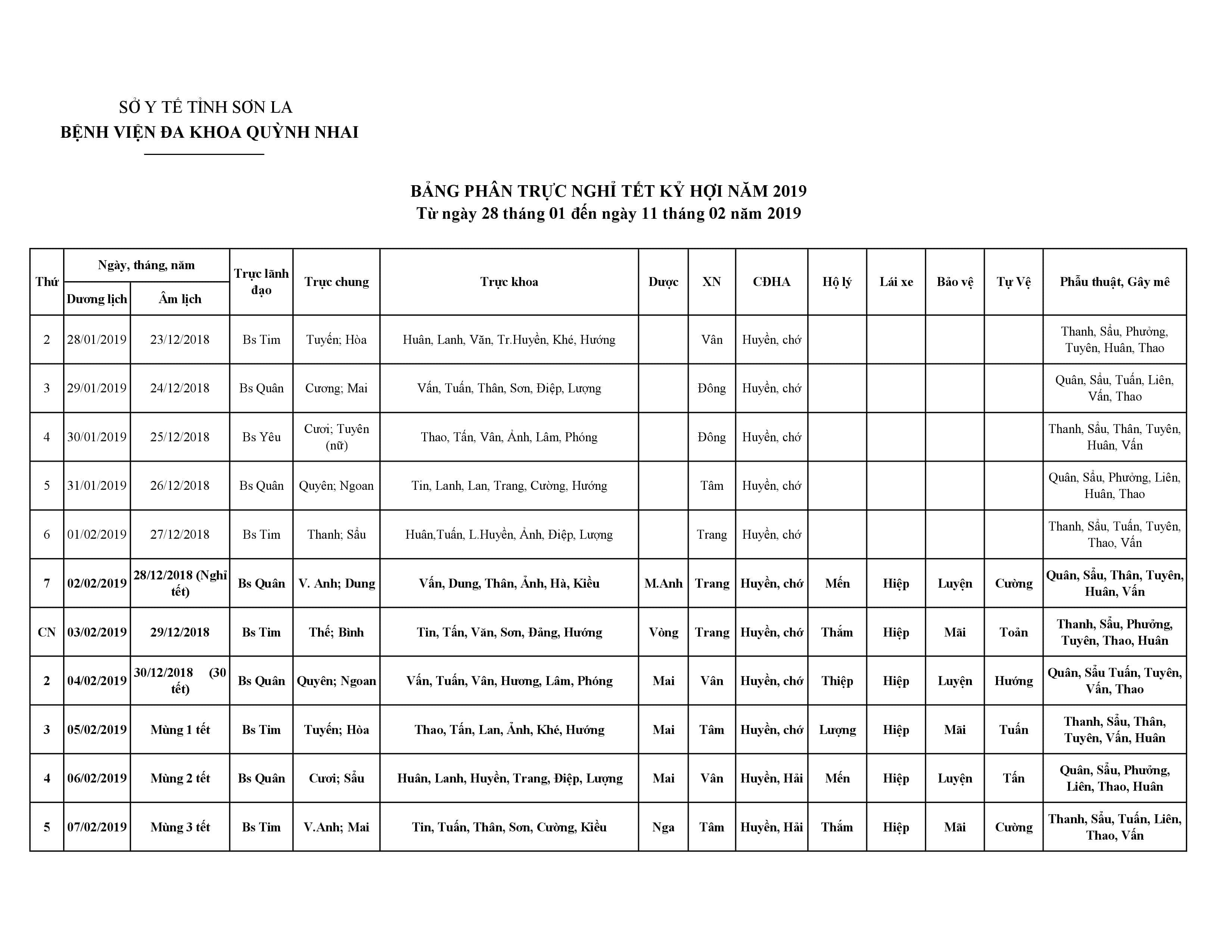 BẢNG PHÂN TRỰC NGHỈ TẾT KỶ HỢI NĂM 2019 Từ ngày 28 tháng 01 đến ngày 11 tháng 02 năm 2019