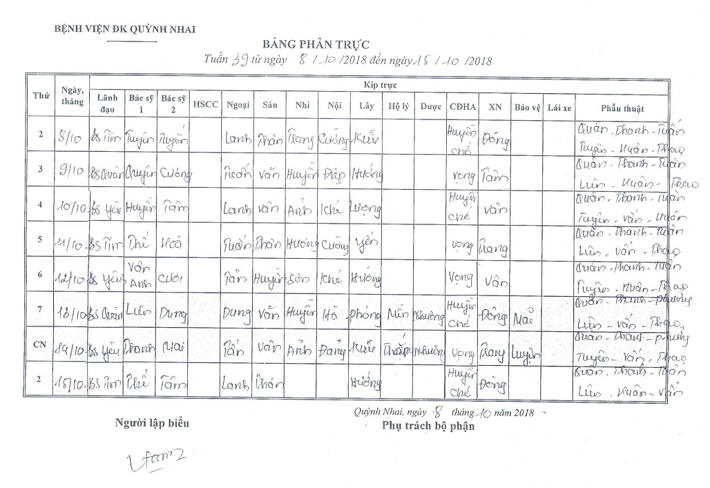 Lịch trực tuần 39 từ ngày 08/10 - 15/10/2018