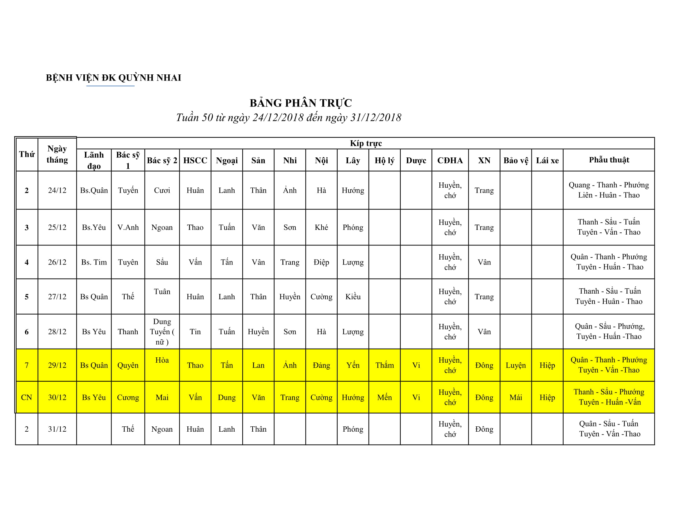 Lịch trực tuần 50. từ ngày 24/12/2018 đến ngày 31/12/2018