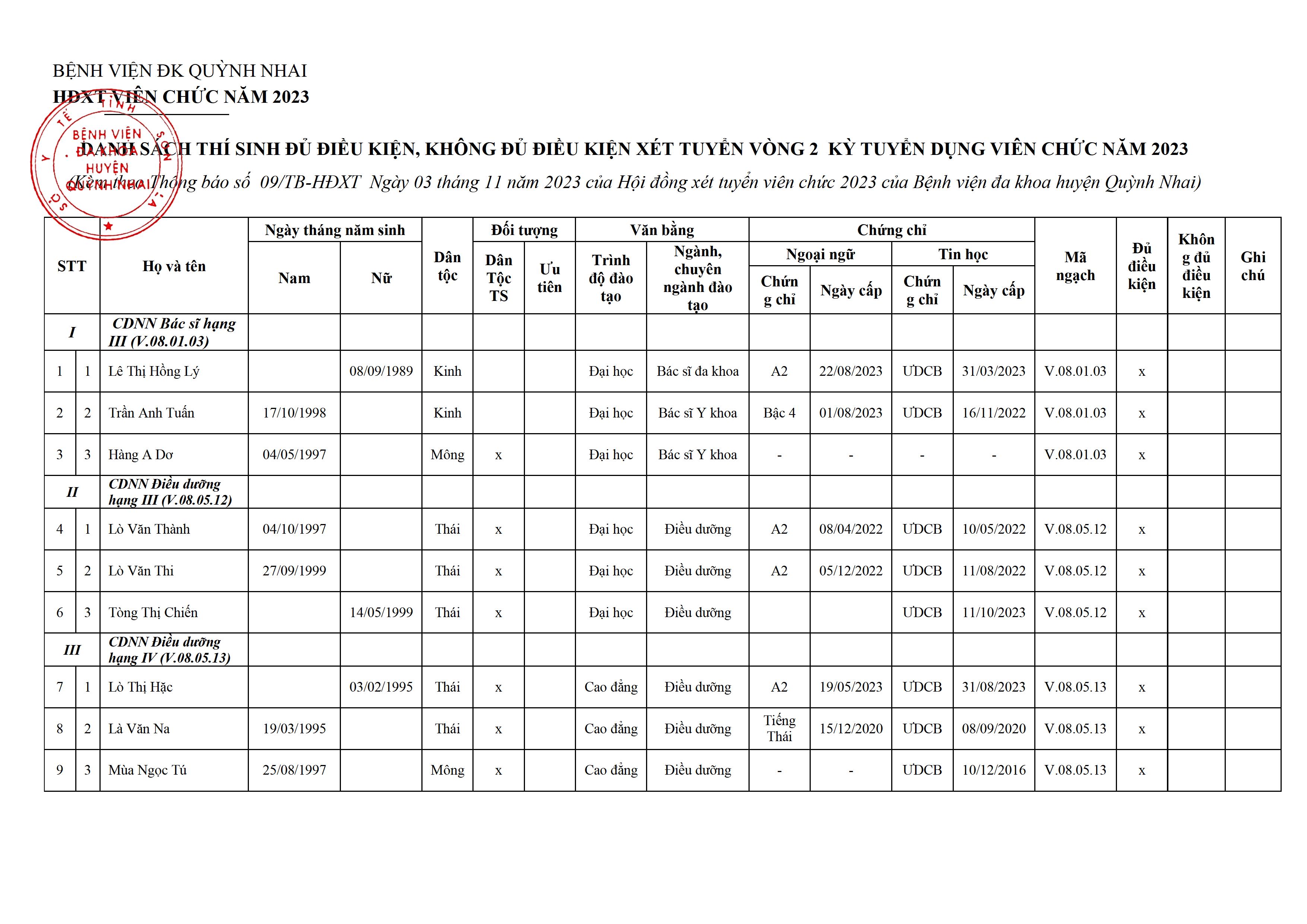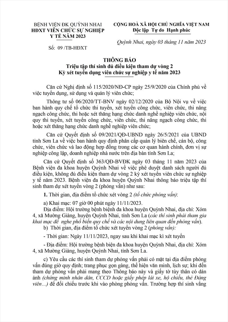 Thông báo Triệu tập thí sinh đủ điều kiện tham dự vòng 2 kỳ xét tuyển dụng viên chức sự nghiệp y tế năm 2023 của Bệnh viện Đa khoa Quỳnh Nhai