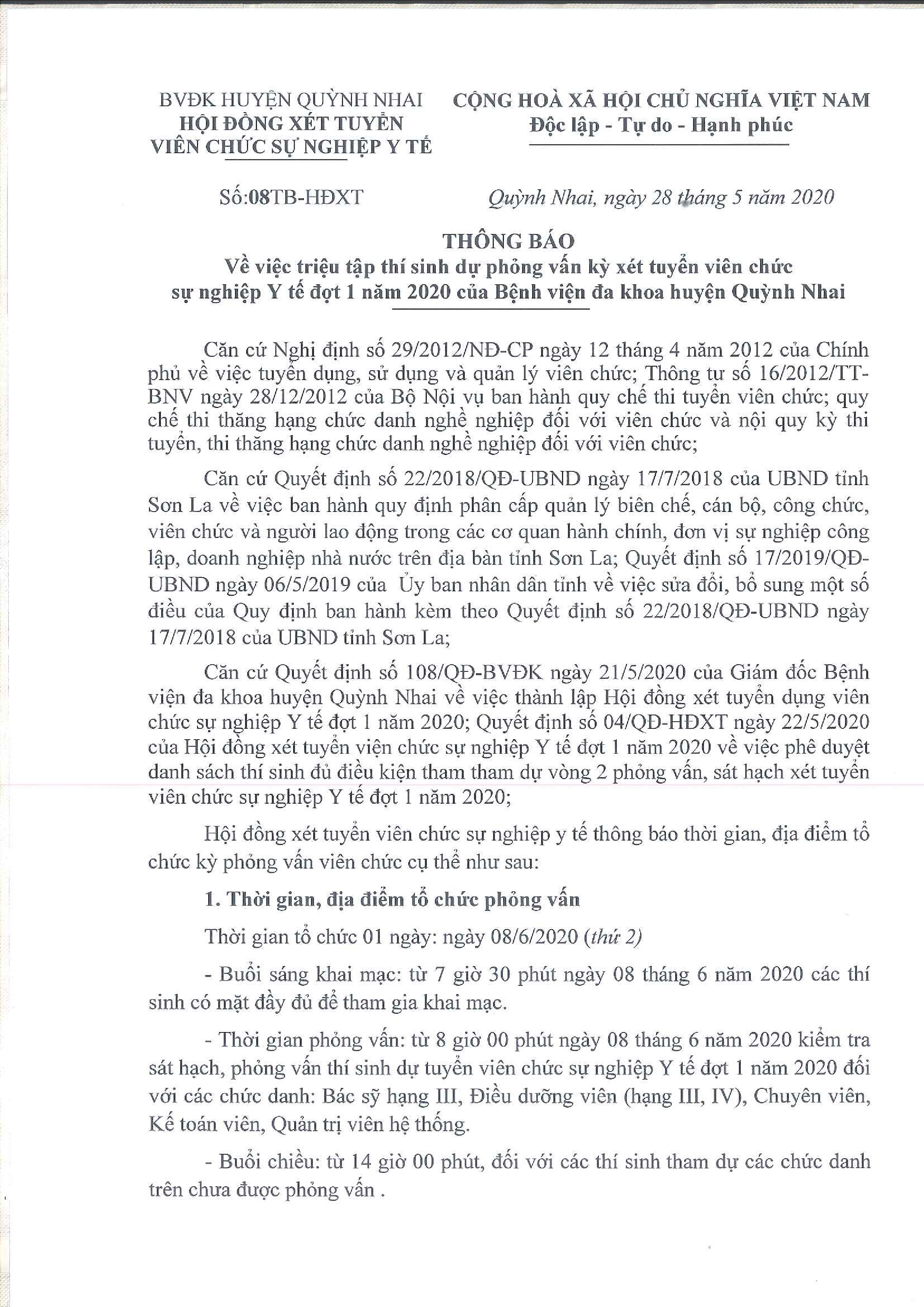 Thông báo triệu tập thí sinh dự phỏng vấn kỳ xét tuyển viên chức sự nghiệp Y tế đợt 1 năm 2020